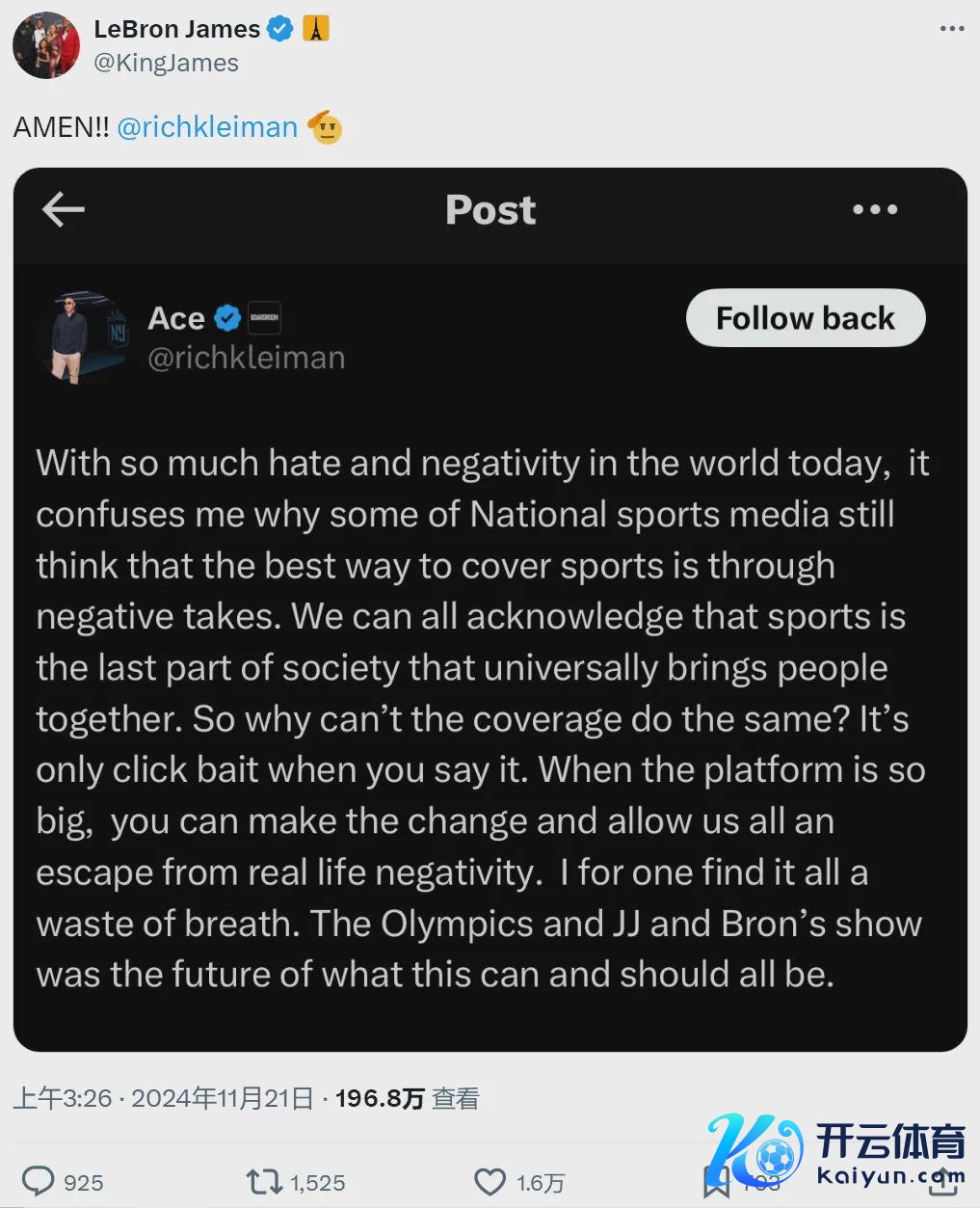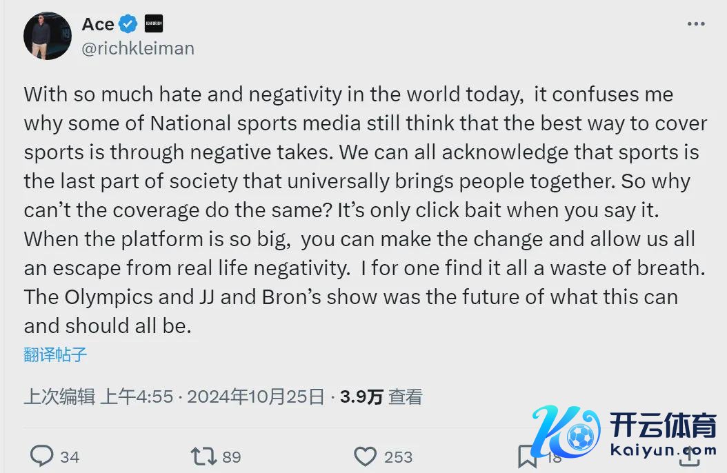 里奇-克莱曼到底写了什么?能让詹姆斯全力支柱,何况径直晓示退网。教主查了一下,克莱曼的这段话是10月25日写的,大约情理如下:“咫尺全国充斥着仇恨和萎靡热沈,许多体育媒体以报说念负面报说念为乐,认为这样才调眩惑眼球。”
