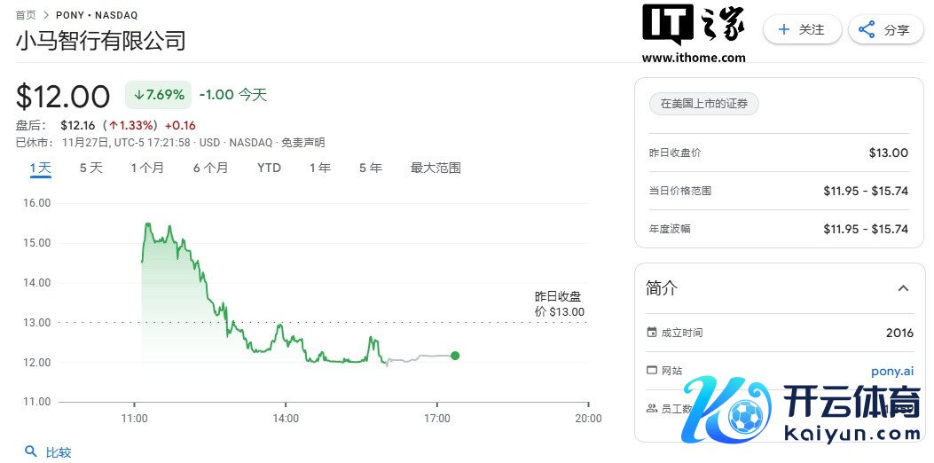 当地本领11月27日,小马智行开盘后一度涨至15好意思元,较初次刊行价高涨15%;最终报收于12好意思元每股,跌幅7.69%,但盘后略有高涨。