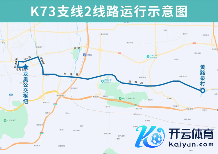 K73支线2由龙奥公交枢纽开往黄路泉村,主要路过龙奥北路、奥体东路、经十路、凤凰路、旅游路。通盘建造龙奥公交枢纽、奥龙不雅邸、龙奥北路奥体东路(路南)、奥体中心体育馆、东谈主保大厦、草山峰东、经十路舜华路、北胡(路南)、经十路凤凰路(路北)、凤凰路经十路、凤凰路龙奥北路、凤凰路华奥路、凤凰路旅游路、小汉峪、小汉峪东、港沟、港沟中学、旅游路凤鸣路、有兰峪、省临床中心蟠龙山院区、章锦西、章锦、旅游路港西路、市委党校、旅游路蟠龙路、济南劳动学院、商职学院、旅游路彩龙路、省委党校东校、历城区委党校、孙家鹊山村南、逯家鹊山村南、黄路泉村站点。