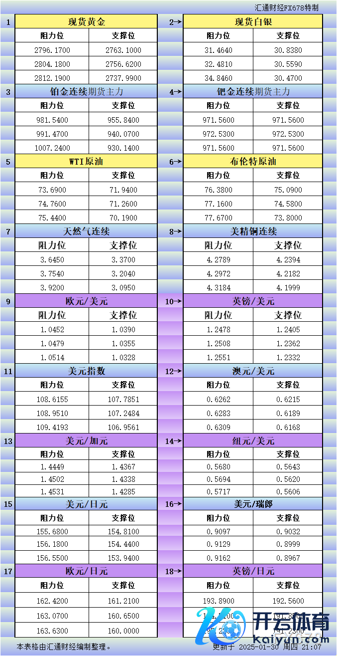 1月30日好意思市更新的黄金、白银、铂金、钯金、原油、自然气、铜(商品)以及:好意思元指数、欧元、英镑、日元、瑞郎、澳元、加元、纽元(热点货币对)的复古阻力位一览。