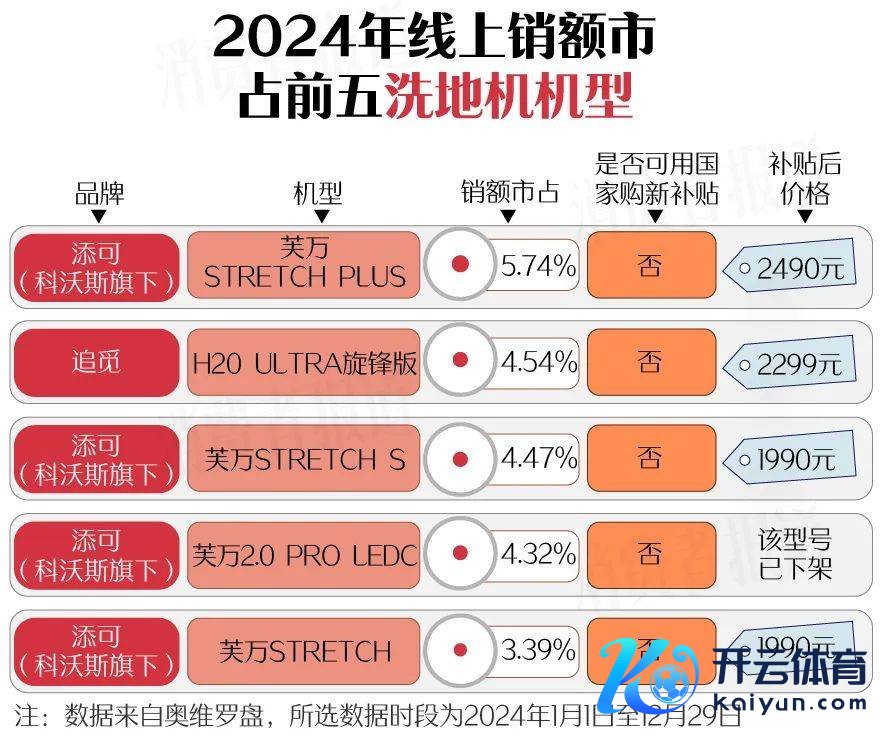 添可芙万STRETCH PLUS成为2024年年度销额冠军,该款洗地机的市占率为5.74%。排行前五的洗地机有4款来自添可,地位与吸尘器中的戴森颠倒。