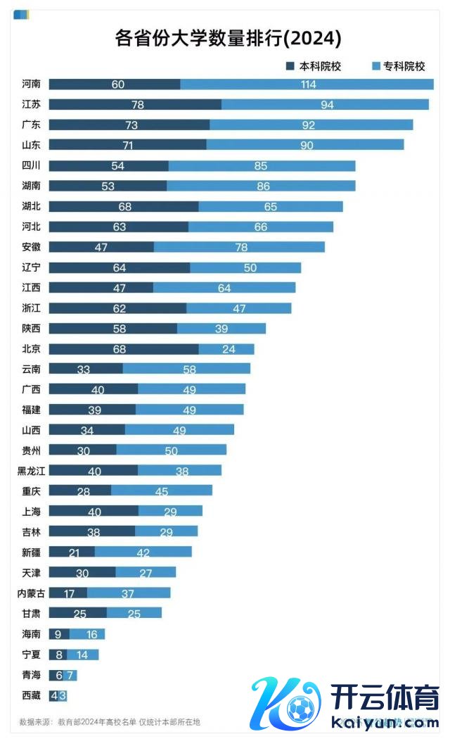 证据证实部发布的 2024 年宇宙高校名单,河南省的高校数目以 174 所的总量,跳动江苏,成为中国高校第一省。