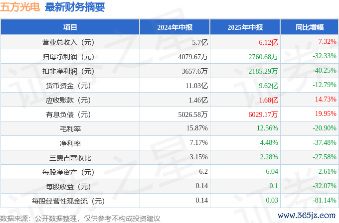 据本站公开数据整理,近期五方光电(002962)发布2025年中报。甘休本讲述期末欧洲杯体育,公司营业总收入6.12亿元,同比飞腾7.32%,归母净利润2760.68万元,同比下跌32.33%。按单季度数据看,第二季度营业总收入3.4亿元,同比飞腾11.72%,第二季度归母净利润1652.15万元,同比下跌14.91%。本讲述期五方光电公司应收账款体量较大,当期应收账款占最新年报归母净利润比达258.09%。