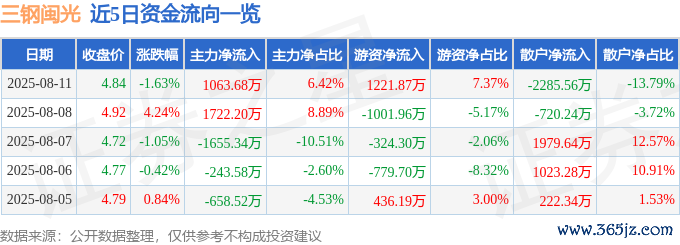 本站音讯,阻挡2025年8月11日收盘,三钢闽光(002110)报收于4.84元,下落1.63%,换手率1.4%,成交量34.05万手,成交额1.66亿元。