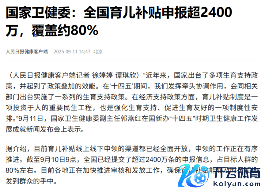 9月11日,国度卫健委副主任郭燕红在国新办“十四五”本事卫生健康责任发展设置新闻发布会上暗意,现在育儿补贴线上线下申领的渠说念都如故全面洞开,申领的责任正在有序鞭策。杀青9月10日9点,寰宇如故提交了朝上2400万条的禀报信息,占主义东说念主群的80%独揽。