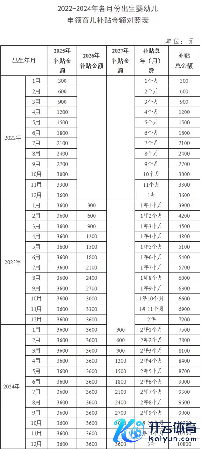 《2022-2024年各月份降生婴幼儿申领育儿补贴金额对照表》如下表所示: